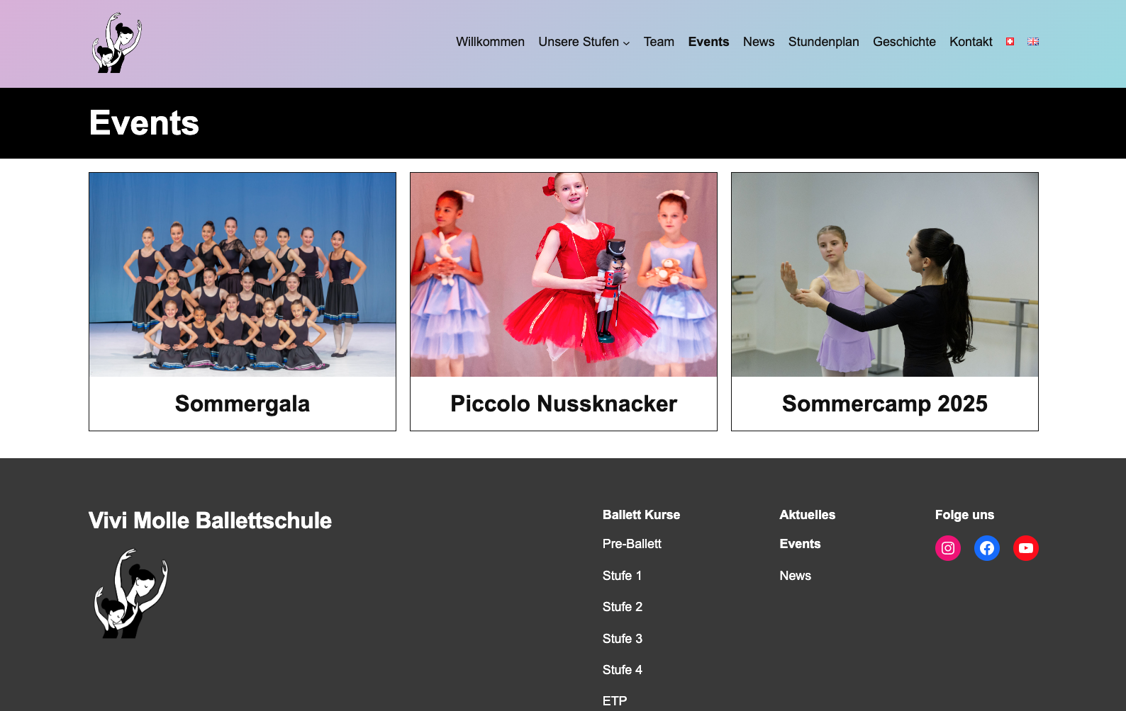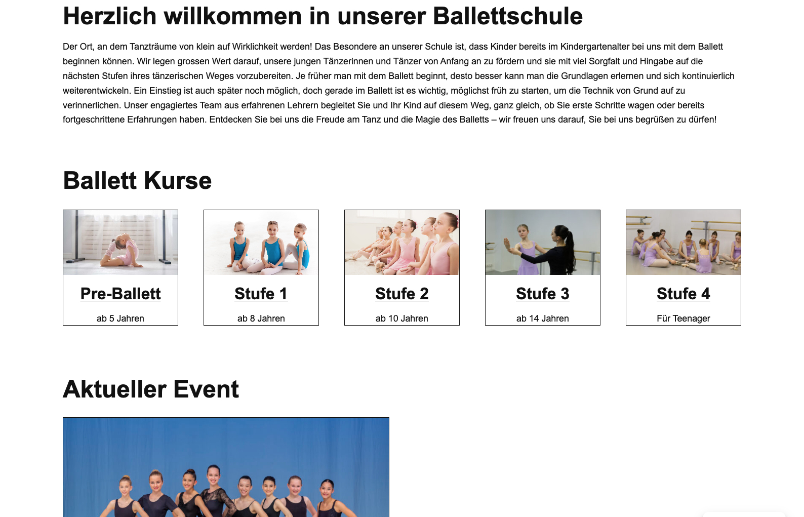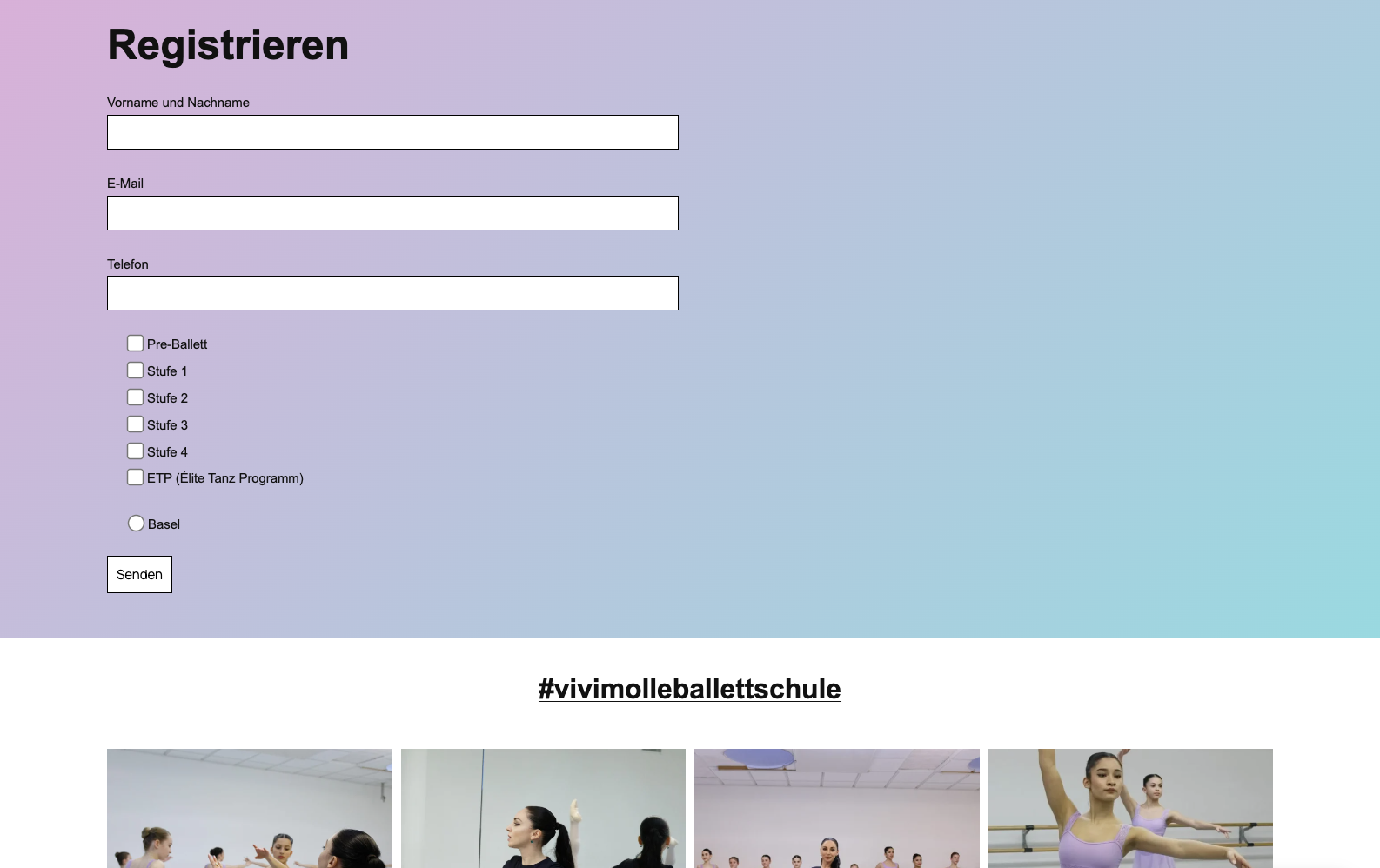 Für die Vivi Molle Ballettschule wurde eine ansprechende und benutzerfreundliche Website entwickelt, die ein integriertes Event-System umfasst. Der Kunde kann eigenständig Veranstaltungen erstellen und verwalten. Zusätzlich wurde ein flexibles Anmeldeformular implementiert, das eine Registrierung für verschiedene Ballettstufen ermöglicht.